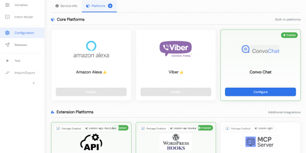 GPT_API_KEY. - If you want to enable it on the front page, go to the Configuration view and enable the Convo Chat platform.